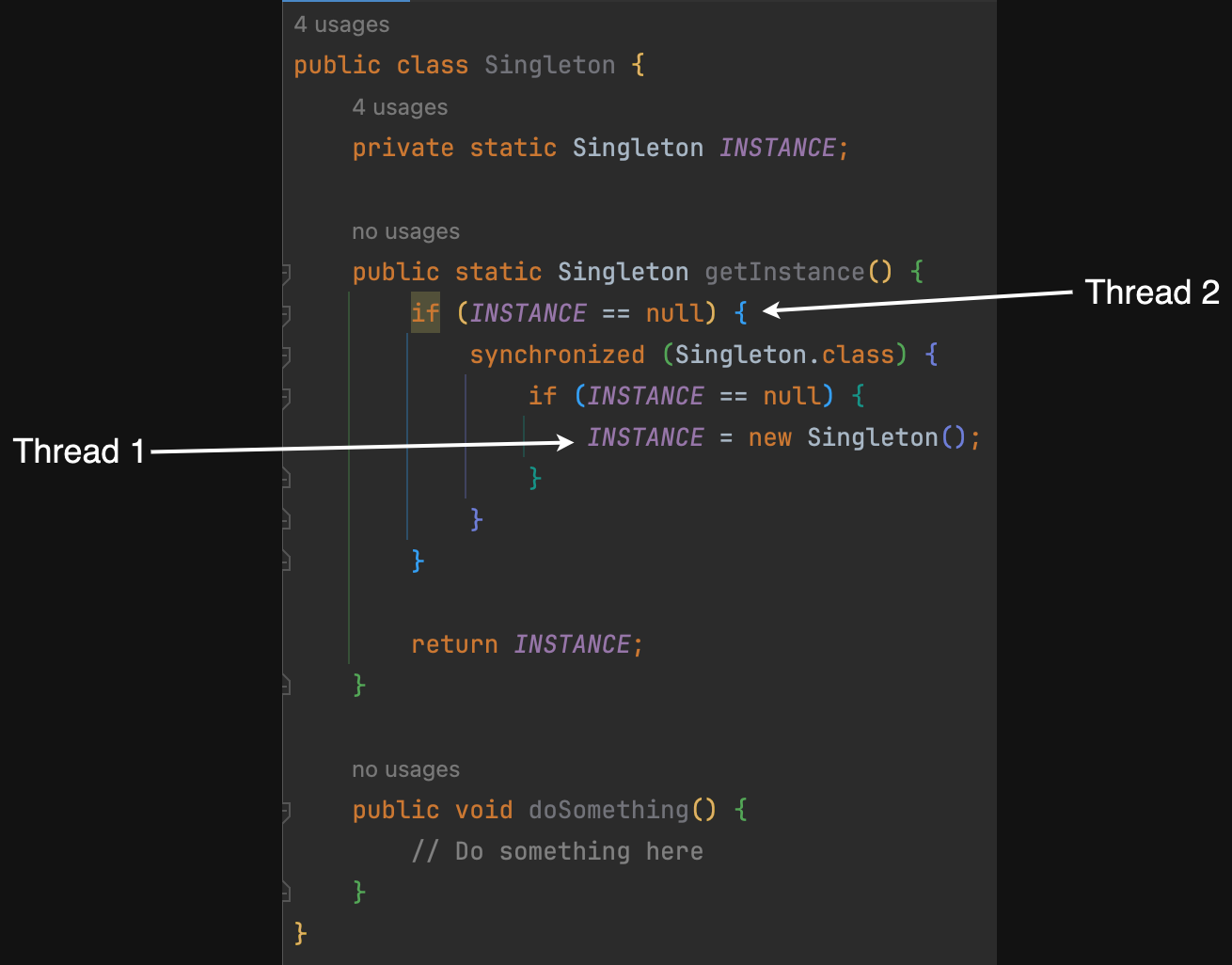 比如有这样一个场景,Thread 1和Thread 2同时请求了Singleton#getInstance()方法,Thread 1执行到了第 8 行,开始实例化这个对象;而Thread 2执行到了第 5 行,开始检查INSTANCE是否为null。这个时候,有一定几率,虽然Thread 2检查到INSTANCE并不是null,但是调用Singleton#doSomething()方法的时候却会抛出空指针异常。