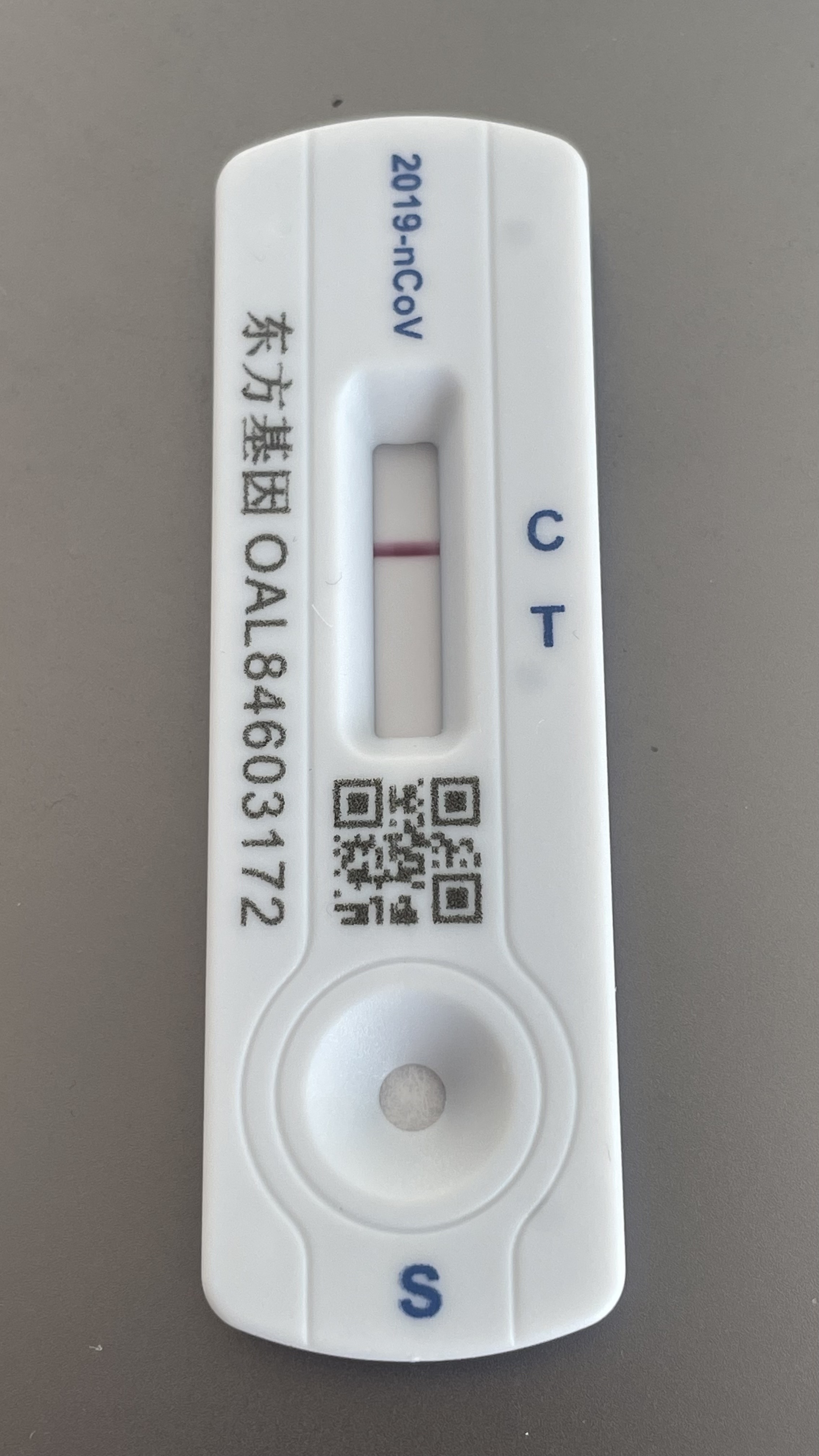 一晚上觉也没睡太好,醒了有三四次,期间还做了不少奇奇怪怪的梦,到了早上 10 点来钟,迷迷糊糊的醒了,但是感觉非常赖床,左滚右滚就是不想起,还感觉身上似乎出了很多的汗。翻腾了大概半小时,终于鼓起勇气,爬出被窝起床。一摸后背,果然湿漉漉的,出了不少的汗。起来刷过牙洗过脸,开始吃药。过了会看到我这还有不少抗原试剂盒,是中旬上海封城的时候发的,于是就拿了一个测了一下,一开始只看见 C 有杠杠,T 没有,还庆幸不是新冠,但是 15 分钟后,T 这里开始出现浅浅的一道。果然,还是没躲掉。