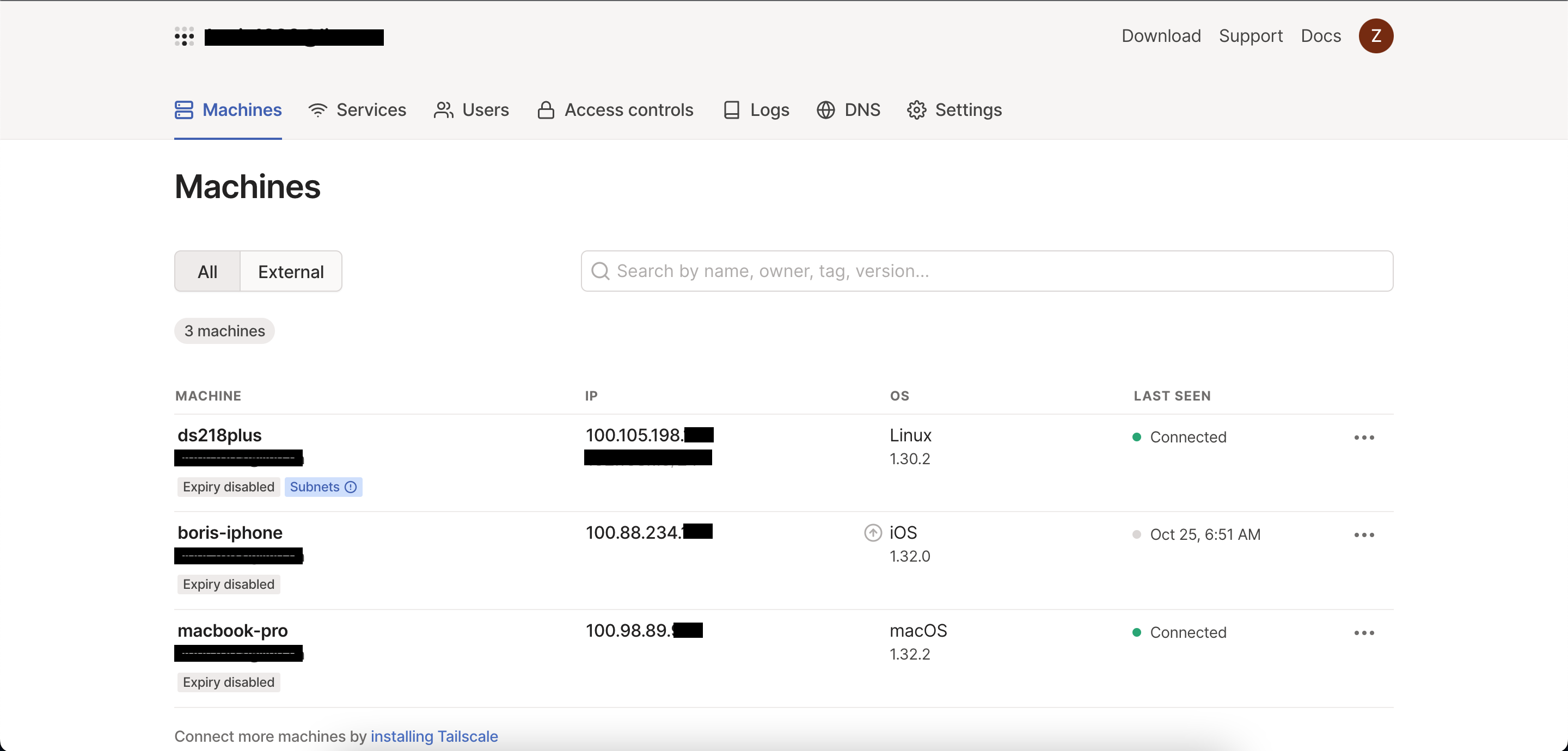 安装 Tailscale 很简单(除了国内群晖),跟着官网的 Quickstart走就行了。简单来说就是先在官网注册账号,然后在电脑上安装 Tailscale 并使用相同账号登陆,然后这些机器就处于同一个虚拟局域网上了。