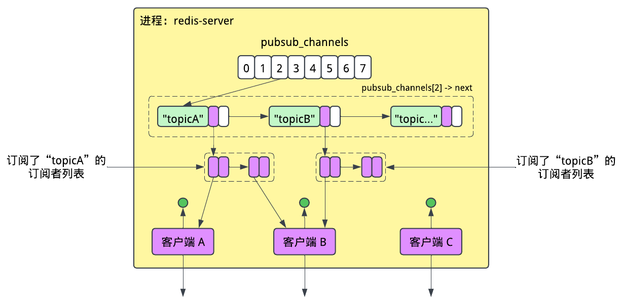 可想而知,遍历所有的通道的效率是非常低的。按道理,Redis 只需要访问” topicA” 这个通道,因为客户端 A 只订阅了它。为了将这个理论变成实际,Redis 标记了各个客户端及其订阅的通道,并将其与pubsub_channels同步。这样,Redis 就只需要访问这个客户端相关的通道,而不需要低效的遍历所有的通道。我们在图中可以将这些标记画成绿色的圆:
