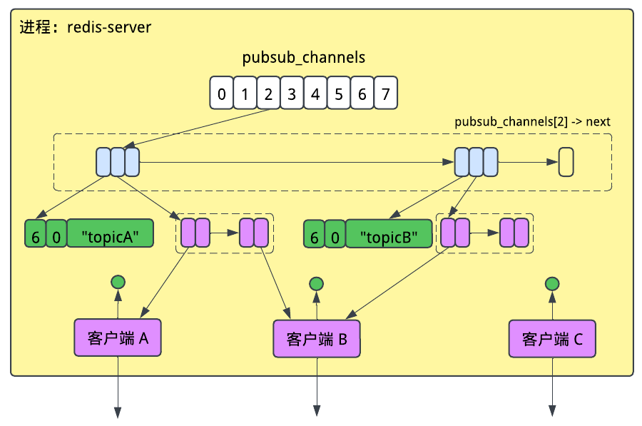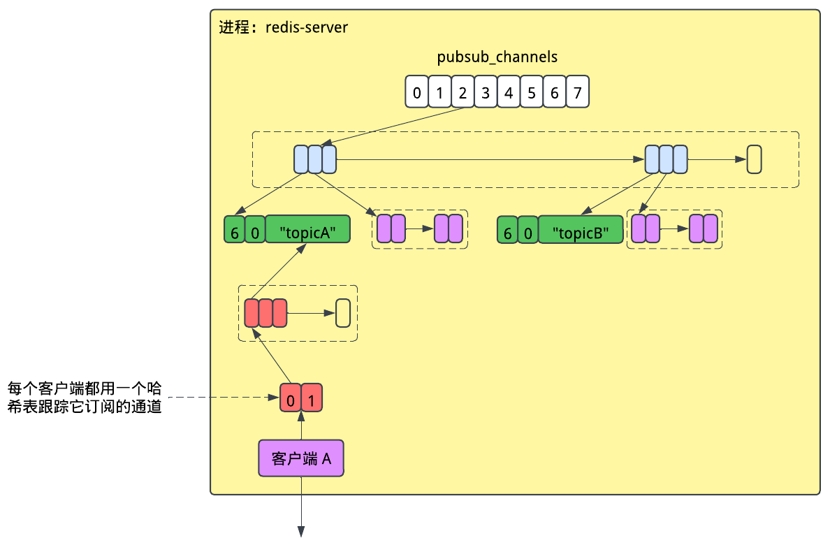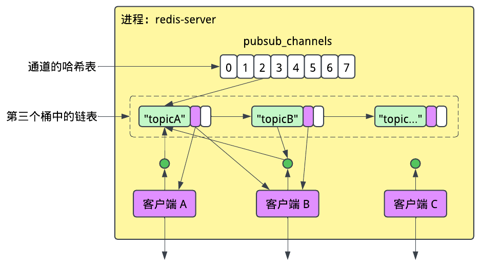包含了 8 个桶的数组pubsub_channels是一块独立分配出来的内存空间。要发布消息到一个通道,首先它会将通道名进行哈希,找到它对应的桶,然后遍历这个通道相关联的各个客户端。然而不同的通道名又可能会被哈希到同一个桶中,为了解决这个哈希冲突问题,Redis 使用了一个叫 “哈希链” 的方案,即每个桶都会指向一个保存着通道的链表。比如在上面的例子中,“topicA” 和 “topicB” 都被哈希到了第三个桶中。实际上为了以防万一,Redis 会在启动时为它的哈希函数选择一个随机的种子来尝试避免出现哈希碰撞,这也可以防止被恶意用户蓄意订阅到会被哈希到同一个位置的大量通道而导致性能下降。