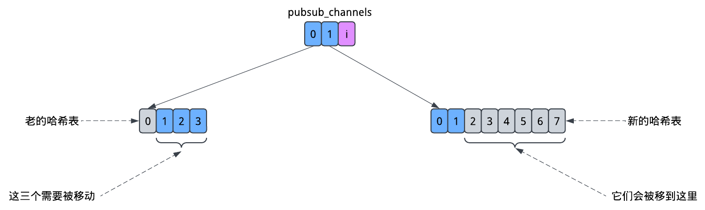 答案是:Redis 会逐步的调整哈希表的大小。它在底层维护了新旧两个哈希表。假设pubsub_channels这个哈希表正在经历调整。