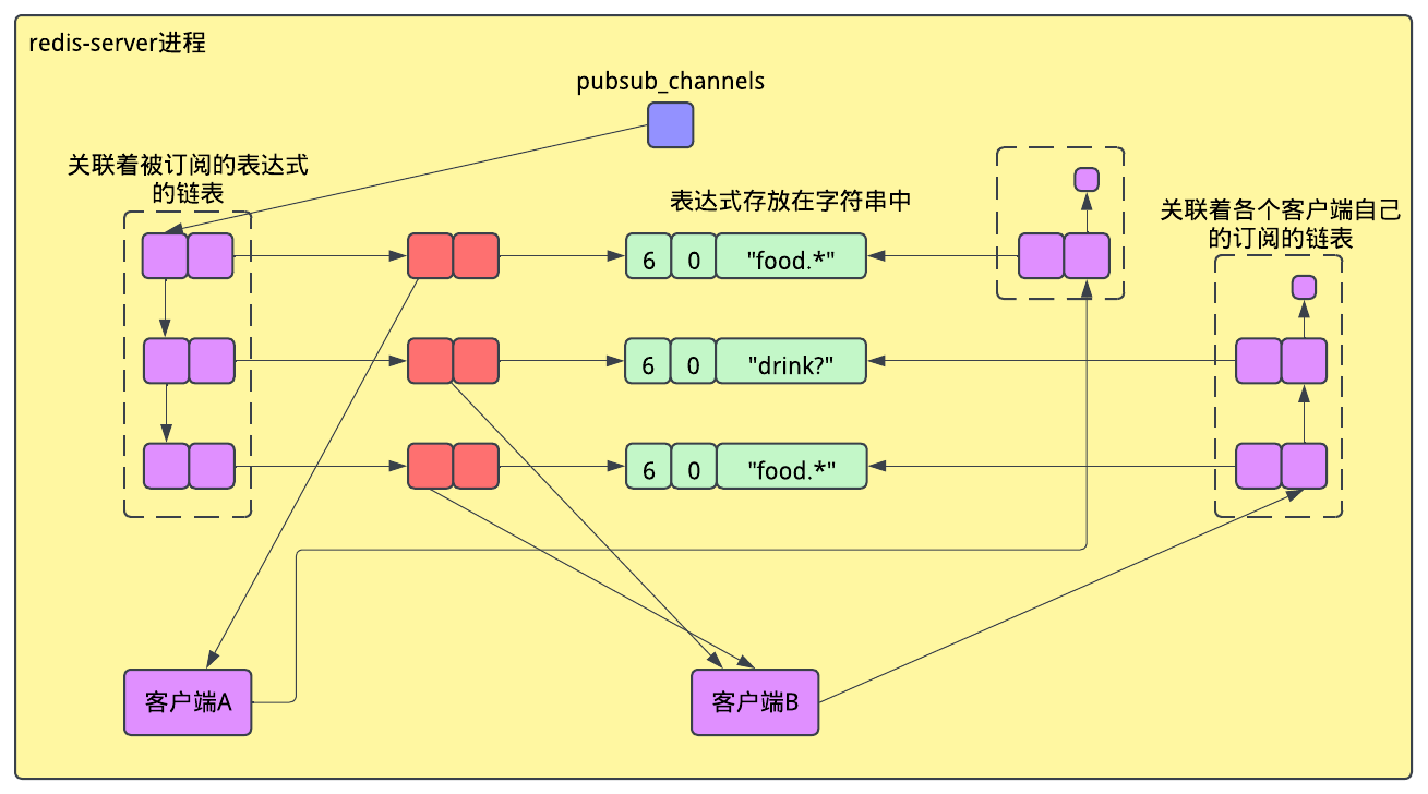 按照表达式订阅的实现是与普通的订阅完全不同的。除了全局的pubsub_channels哈希表之外,还有一个全局的pubsub_patterns列表。这是一个包含了pubsubPattern对象的列表,每个对象与一个客户端订阅的一个表达式相关联。类似地,每个客户端对象也有一个包含着它订阅的表达式的链表。下图展示了当客户端 B 订阅了drink?,同时客户端 A 和客户端 B 订阅了food.*之后,redis-server 进程的内存的样子: