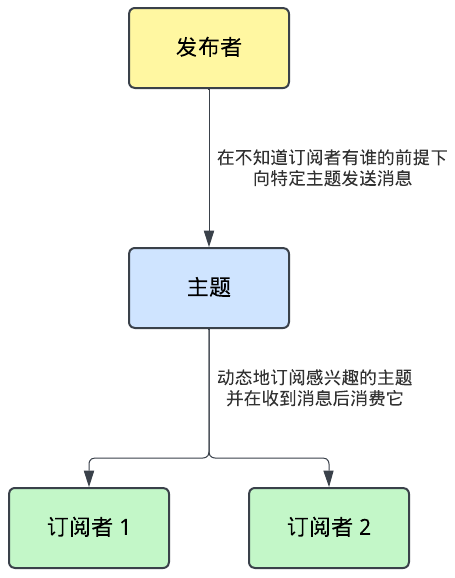 | 一对多 | 包括一个发布者和多个订阅者。发布者向主题发送消息,所有订阅这个主题的订阅者都将收到这个消息。 |