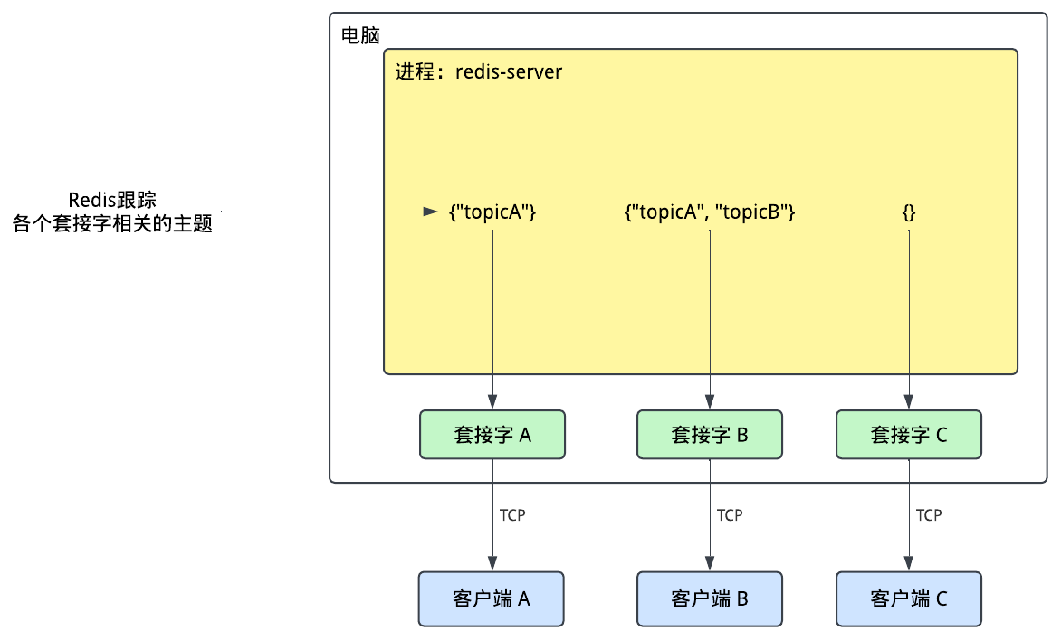 如果放大了看 Redis 里面发生了什么,我们可以想象 Redis 会跟踪每个套接字 (socket) 的订阅集:
